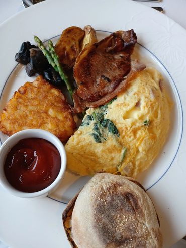 All omelets come with your choice of meat, peppers, onions, mushrooms and cheddar cheese hashbrowns and buttered toast.